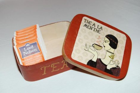 Ez a teafilter tartó Anyukám kolleganőjének a kérésére készült, aki egy Milfordos teás bobozt szeretett volna. A netről kerestem Milfordos teásdobozokat, amiről a képeket szalvétára kinyomtattam, és decoupage tecnikával pedig elkészítettem a teafilter tartót.